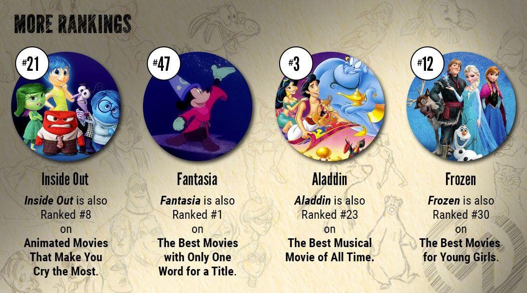 We're talking disney animated movies, and excluding pixar, and movies also had to be theatrically released in order to qualify. All films in the top 50 were released after 2000. May 10, 2016 at 5:16 p.m. Now a days animated movies become more popular,because world loves animation.from child to old everybody likes it.here is the world top 100 animated movies of all time,according to me. This is a fairy tale for the modern age, warping tropes into an original and charming love story that also happens to be filled.